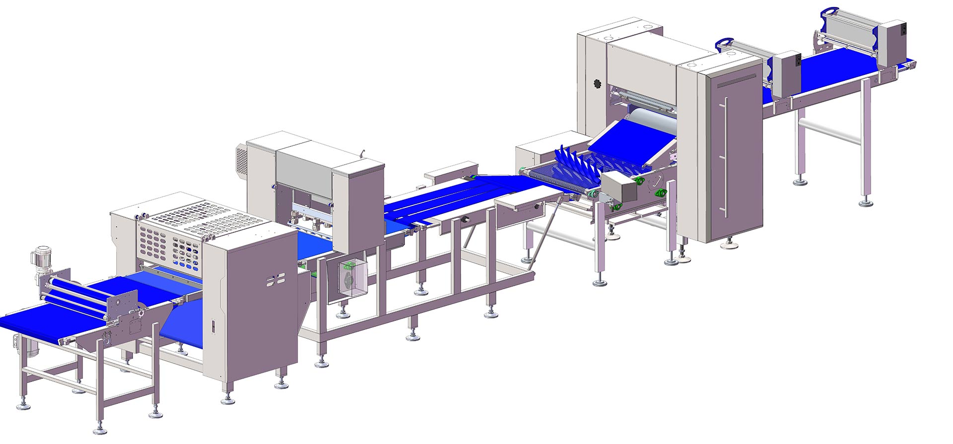 This working table is a flexible croissants making up line. The line integrates automatic stamping, turning and curling to achieve the industrial production of croissants. Rolled laminated dough is put and further processed on the line into customized croissants.
